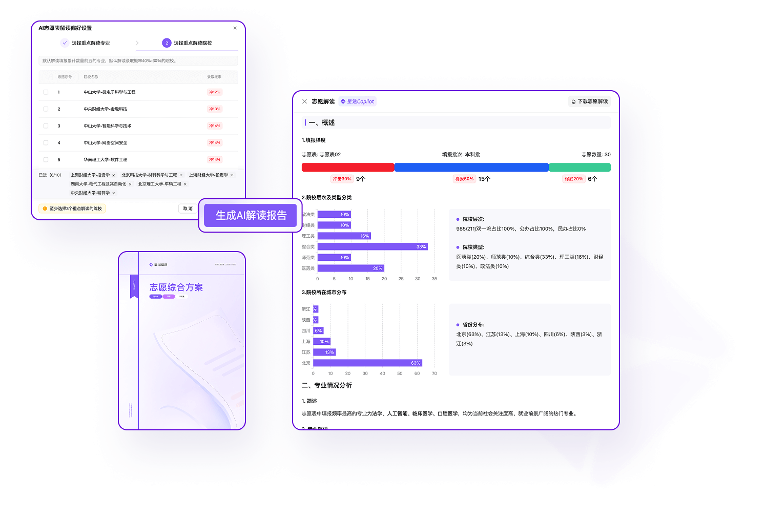 AI将复杂的院校数据、分数位次、专业适配性等信息,以直观的方式呈现给家长和学生,让他们读懂每一项推荐的背后逻辑。高报师无需耗费大量时间组织信息、书写方案报告