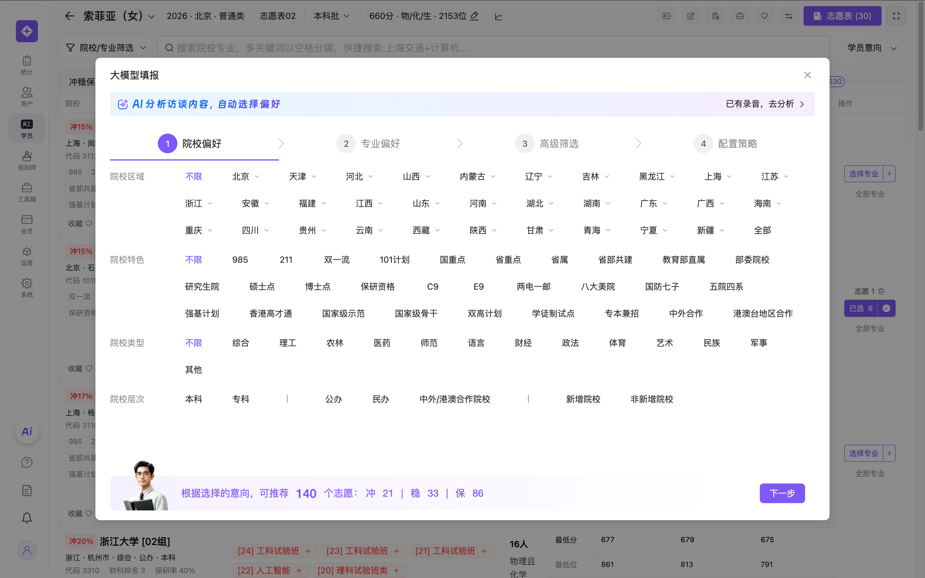 大模型实时分析访谈录音,获取学生的地域偏好、意向专业、家庭背景等核心需求,并生成访谈纪要和填报方案